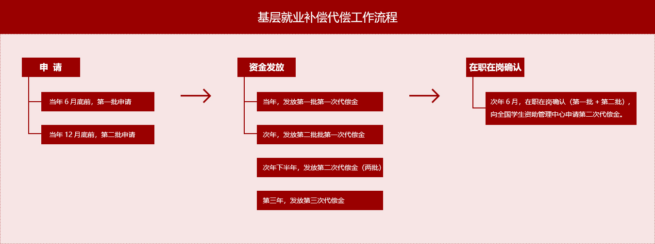 自愿到中西部地区和艰苦边远地区县以下基层单位工作、服务期达到3年以上(含3年)的应届毕业生,享受最后一个学制内的全部学费补偿或贷款代偿资助(在学期间没有申请贷款的学生只能申请学费补偿,申请贷款的学生任选其一进行代偿)。代偿资金分为三年发放,第一年按照申请材料要求提交申请并成功的学生获得33%的代偿资金,第二年完成在职在岗确认后获得第二次的33%的代偿资金,第三年完成在职在岗确认后获得最后的34%代偿资金。